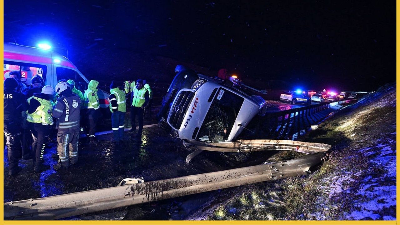 F.S. idaresindeki 34 LPT 868 plakalı servis aracı, otoyolun karla kaplanan ve altı buz tutan kesiminde direksiyon hakimiyetini kaybetti. Savrulan araç, kendi ekseni etrafında ters döndükten sonra bariyerlere vurarak yan yattı.