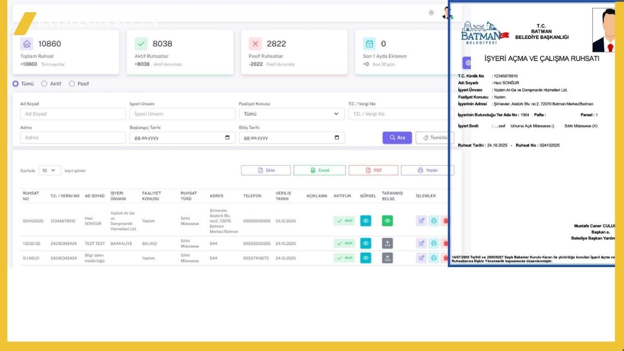 Batman genelinde yürütülen dijital dönüşüm sayesinde, kaç işyerinin ruhsatının bulunduğu ve hangi faaliyetlerde bulunduğu da artık net ve izlenebilir hale geldi.