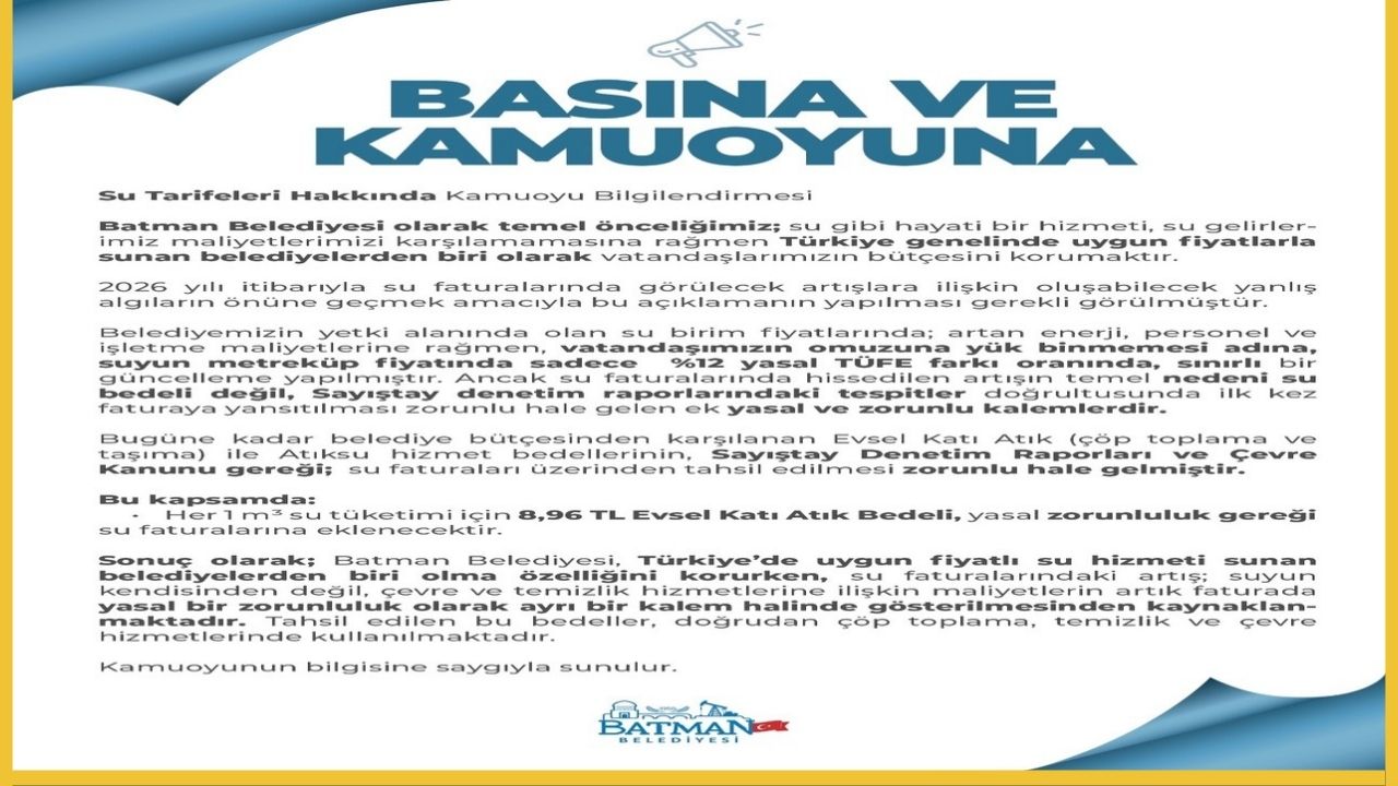 Geçmiş dönemlerde Batman Belediyesi tarafından sübvanse edilen ve belediye bütçesinden karşılanan bazı hizmet bedellerinin, artık kanuni düzenlemeler gereği doğrudan faturalandırılması gerekmektedir.