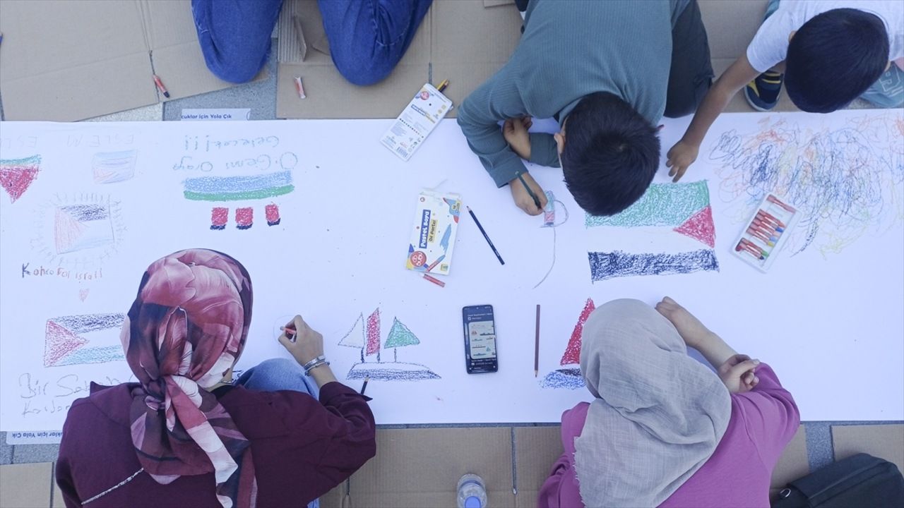 Etkinlikte bir araya gelen katılımcılar, yere serilen kağıtlara Filistin'deki çocuklar için resim çizdi.