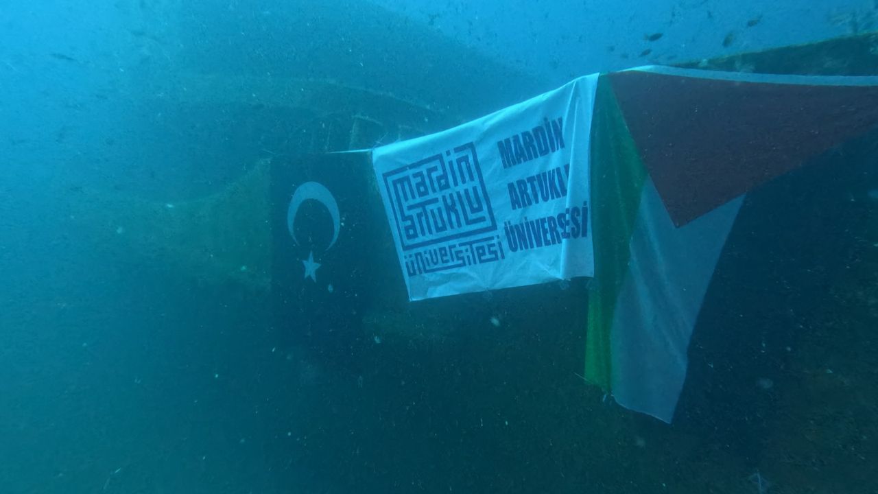 MARDİN (AA) - Mardin Artuklu Üniversitesi personeli, dalış eğitmeni Cenk Yılmaz ve ekibi, İzmir'de gemi batığının bulunduğu bölgede Türk ve Filistin bayrağı açtı.