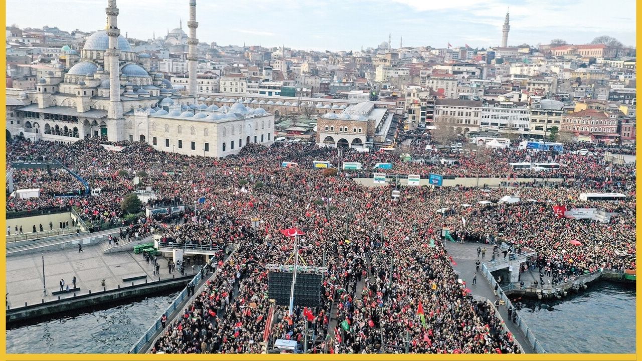 Galata Köprüsü üzerinde taşınan dev Türk ve Filistin bayrakları, atılan tekbirler ve "Özgür Filistin" sloganları, İstanbul’un sesini Kudüs’ün dar sokaklarına kadar taşıdı.