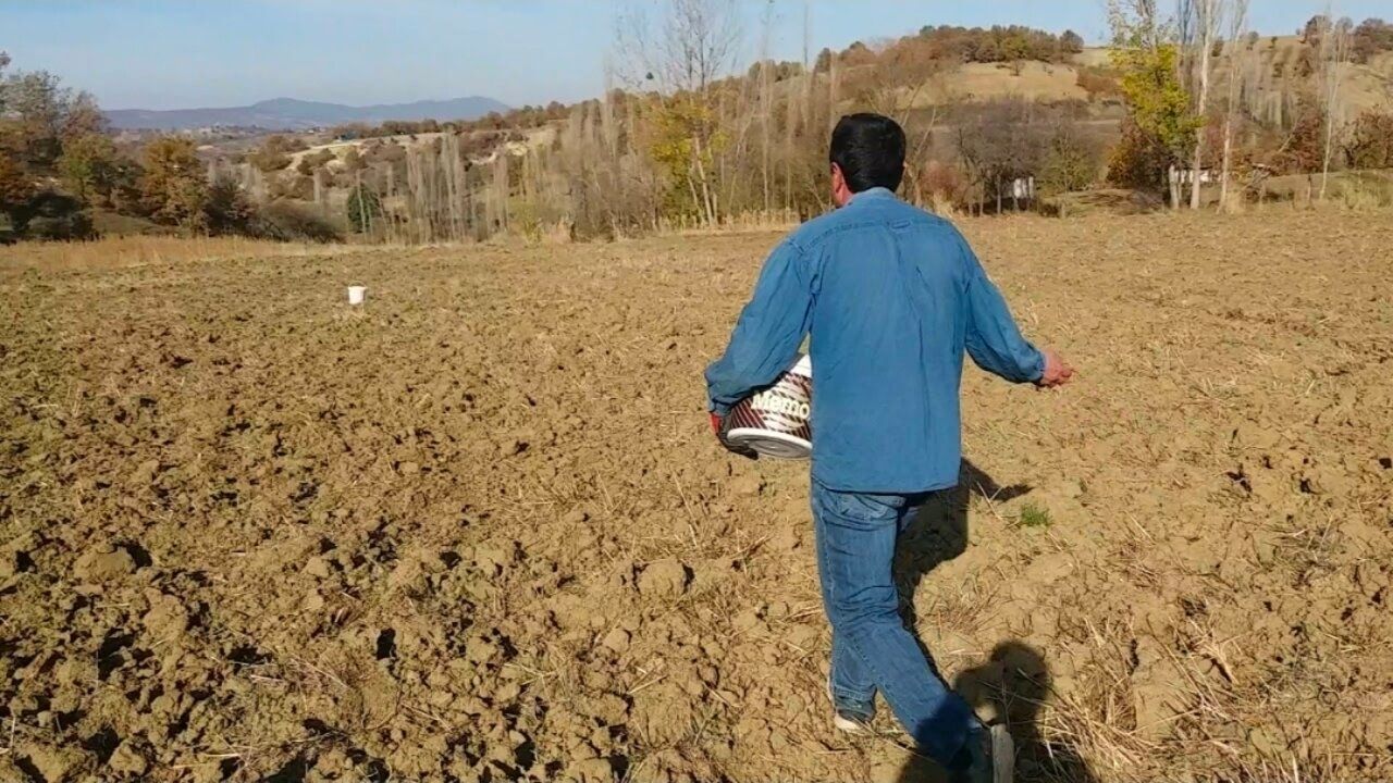 Sabahın erken saatlerinde tarlaya giden çiftçiler, bellerine bağladıkları bez torbalara koydukları gübreyi elle buğday ve arpa tarlalarına serpiyor.