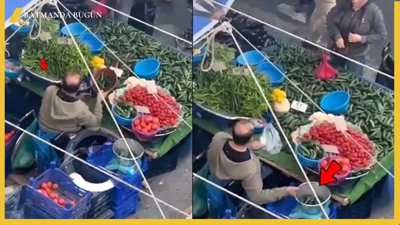 Görüntülerde, tekerlekli sandalyede oturan engelli bir pazarcının, müşterinin özenle seçtiği kaliteli salatalıkları, tezgahın kendi tarafında bulunan bölümden aldığı bozuk ve düşük kaliteli ürünlerle değiştirdiği anlar belgelendi.
