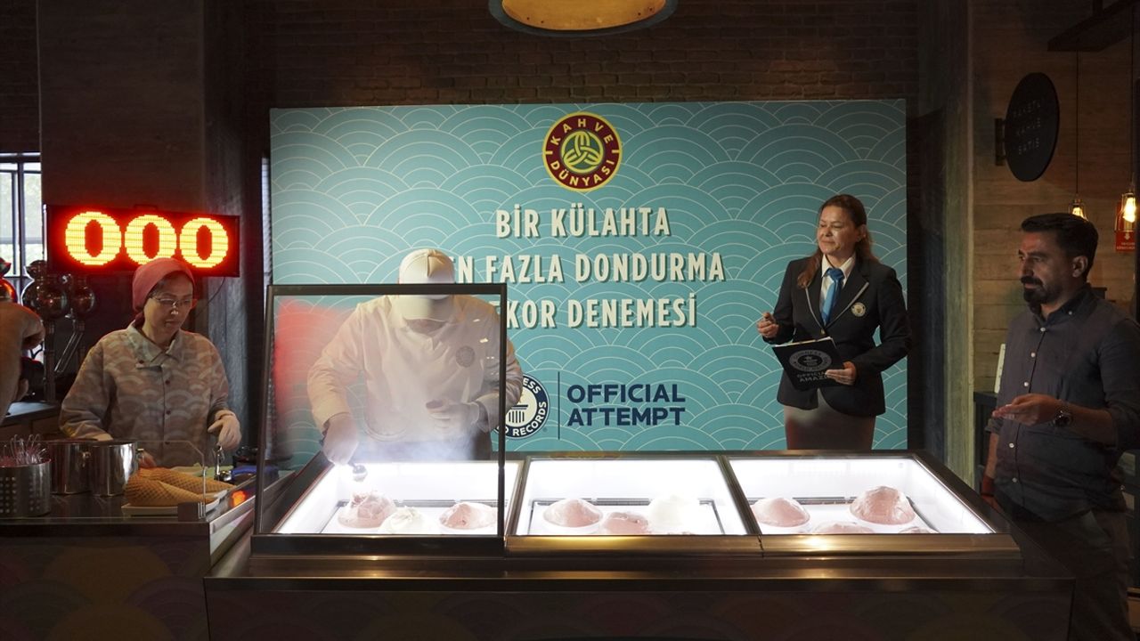 Guinness World Records Türkiye Hakemi ve Temsilcisi Şeyda Subaşı Gemici de Kahve Dünyası ve Gökhan Şahin'in, 'Bir külah üzerinde dengede duran en fazla dondurma topu' rekor denemesini gerçekleştirdiğini söyledi.