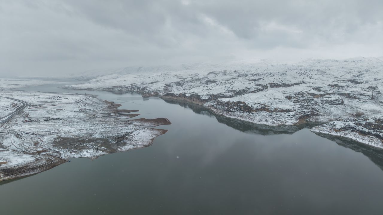 Kar yağışı sonrası beyaz örtüyle kapanan Ilısu Prof. Dr. Veysel Eroğlu Barajı'nın çevresi havadan görüntülendi.