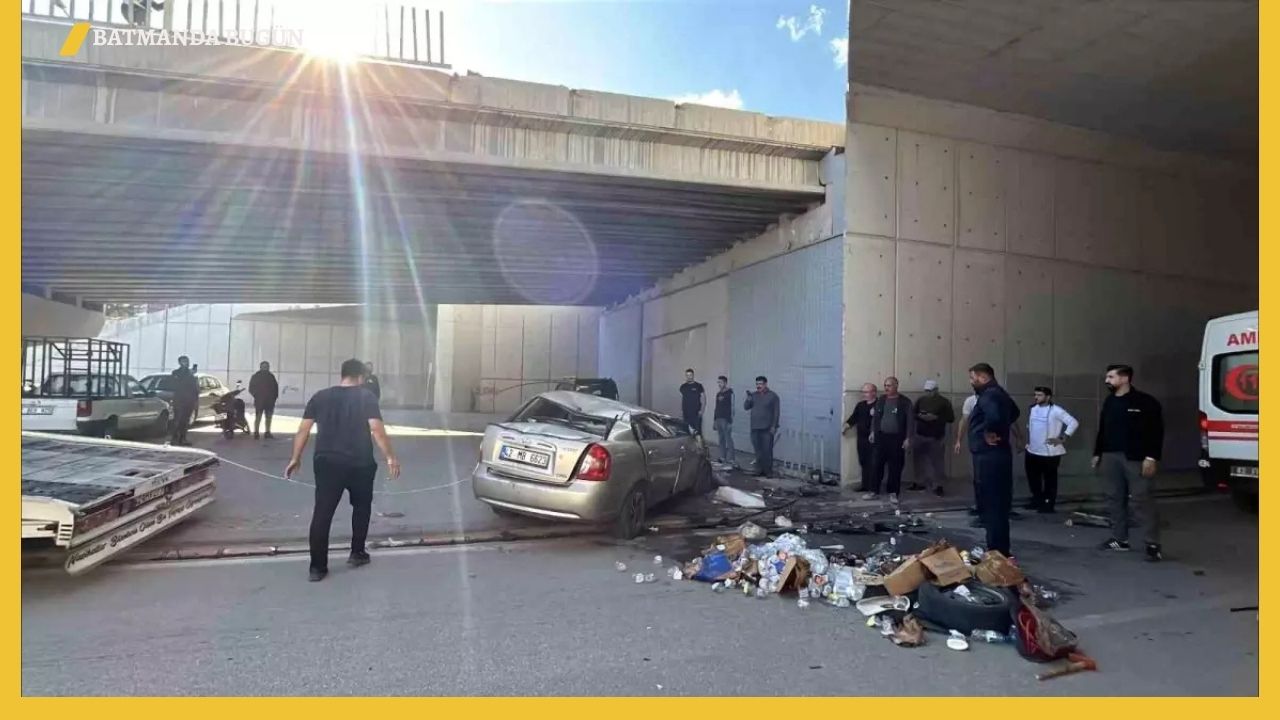 Çarpmanın etkisiyle araç, üst geçitten aşağı caddeye düştü.