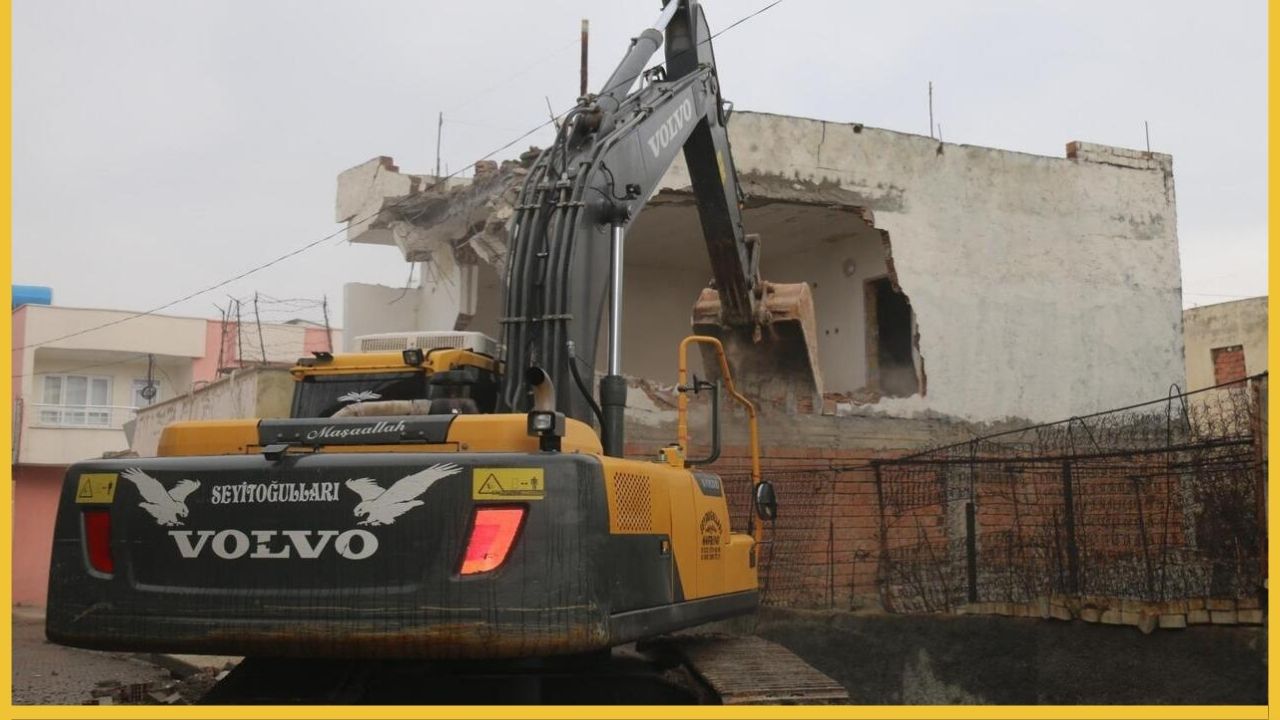 Vatandaşların can ve mal güvenliğini öncelik haline getiren ekipler, tespit edilen tehlikeli yapıları iş makineleriyle kontrollü bir şekilde yerle bir ediyor.