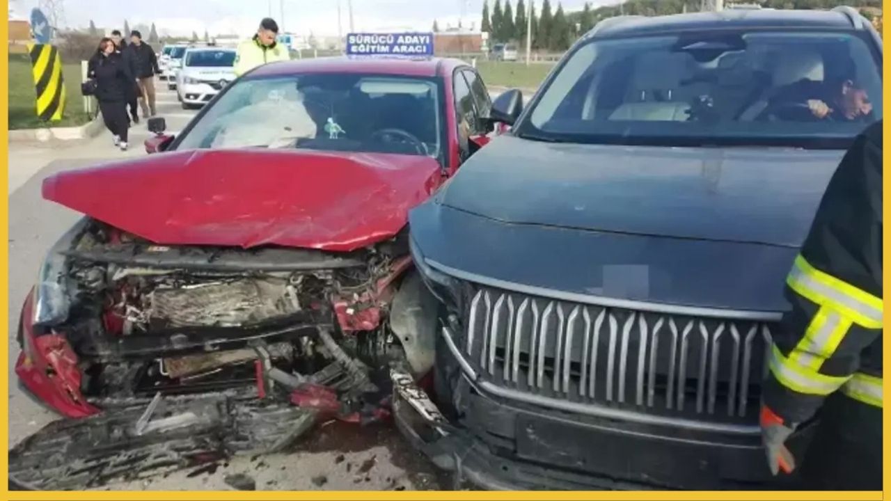 Sınav güzergahında seyir halindeki kurs aracı ile Türkiye’nin yerli otomobili Togg çarpıştı.