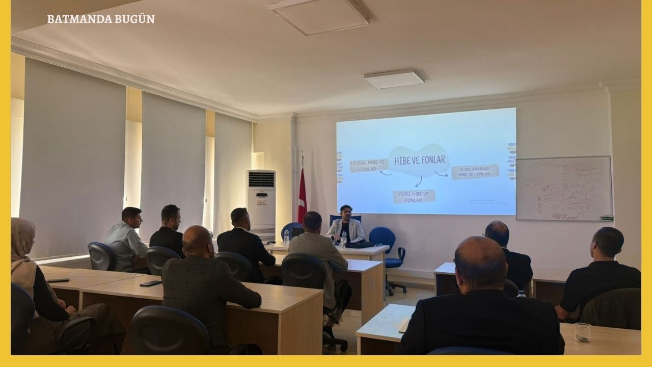 Eğitimde, ulusal ve uluslararası hibe programları, proje döngüsü yönetimi, proje fikri geliştirme süreçleri ve başvuru aşamaları hakkında bilgilendirme yapıldı.